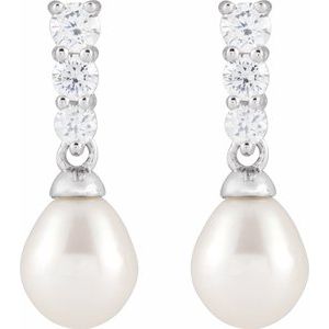 689021 / Earring / Set / Cultured White Freshwater Pearl / Pearl / 7.0-8.0 Mm / Rhodium-Plated Sterling Silver / Imitation Cubic Zirconia / Pair / Friction Backs Included / Polished / Cultured Freshwater Pearl And Imitation Cz Dangle Earrings