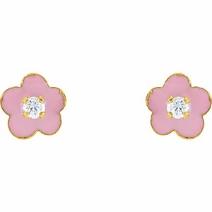 14K Yellow 2 mm Imitation White Cubic Zirconia & Pink Enamel Flower Youth Earrings